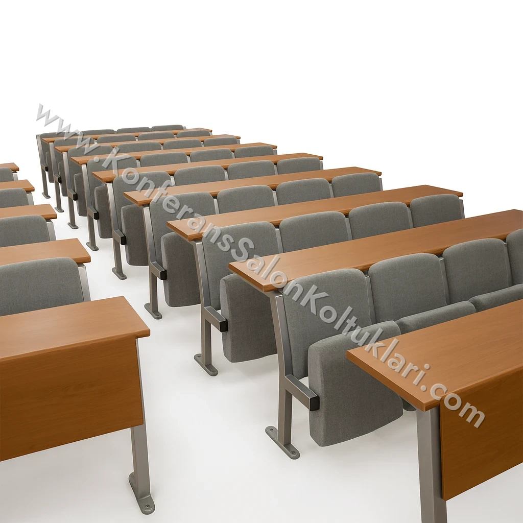 Modern üretim teknikleriyle üretilen amfi sıraları; çelik konstrüksiyon gövde, yüksek yoğunluklu sünger/ahşap oturak ve sırt yapısı ile uzun ömürlüdür. Seçime bağlı açılır-kapanır veya sabit yazı tablası seçenekleri, not alma ve bilgisayar/tablet kullanımını kolaylaştırır. Mikro alev almaz döşeme kumaşı (opsiyonel) güvenlik ve dayanıklılık standartlarını destekler.